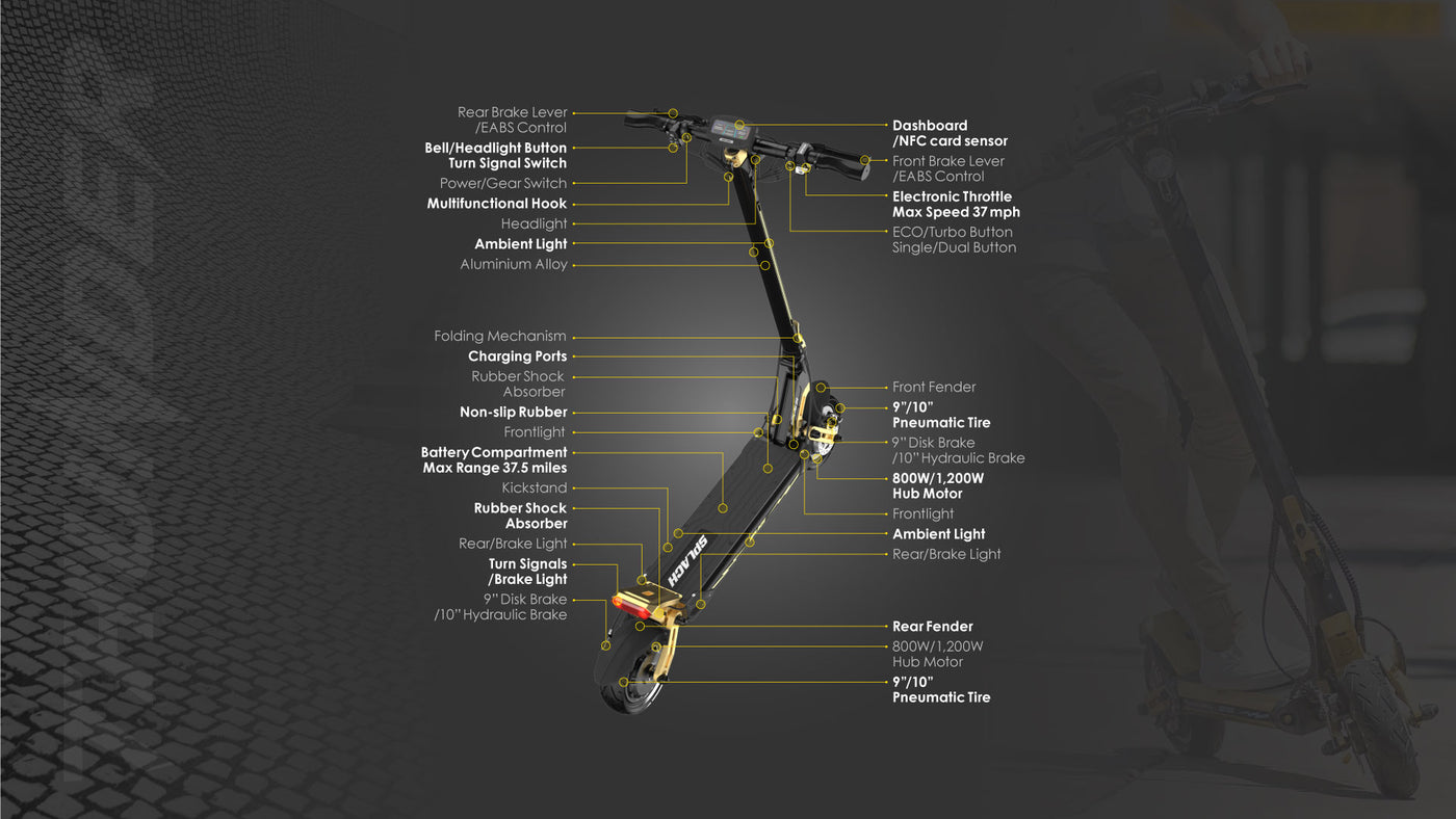 Equipped with both disc brakes and an E-ABS system, it provides agile stopping power. The Thunder 9 features mechanical disc brakes, while the Thunder 10 is equipped with hydraulic brakes.